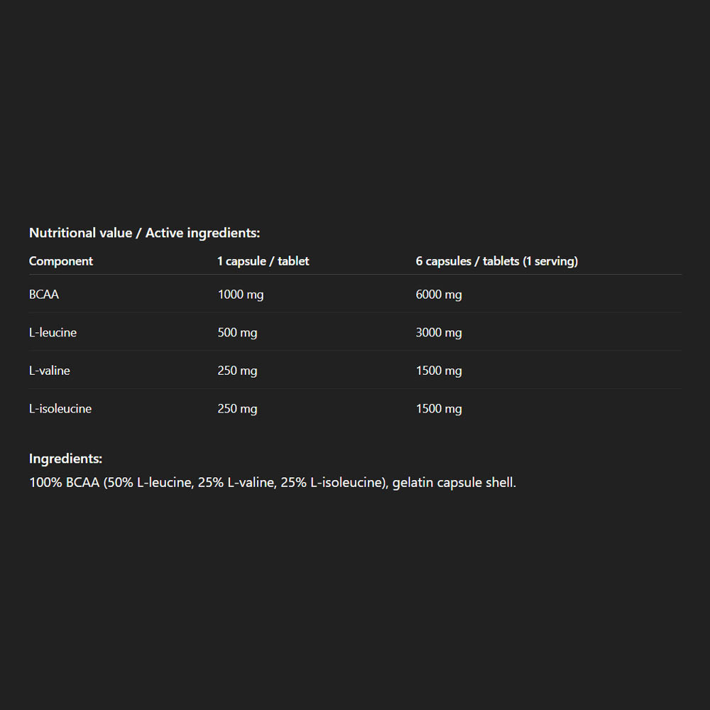 ALLNUTRITION BCAA 2:1:1 1000 XTRACAPS sind verzweigtkettige Aminosäuren im klassischen 2:1:1 Verhältnis – Leucin, Valin und Isoleucin – in einer praktischen Kapselform. Sie sind die perfekte Lösung für alle, die ihre Ernährung mit essenziellen exogenen Aminosäuren ergänzen möchten, die der Körper nicht selbst herstellen kann.