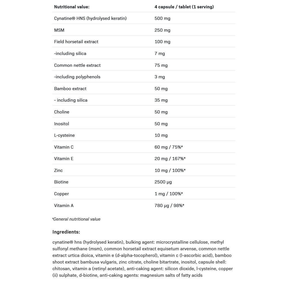 Dies ist kein herkömmliches Nahrungsergänzungsmittel, sondern ein professionelles, pflegendes Kosmetikum, das von innen wirkt, um den optimalen Zustand Ihrer Haut, Haare und Nägel zu erhalten. Unter anderem enthält es ein patentiertes, hoch bioverfügbares Keratin, das von einem amerikanisch-französischen Hersteller produziert und unter dem Namen Cynatine NHS registriert ist.