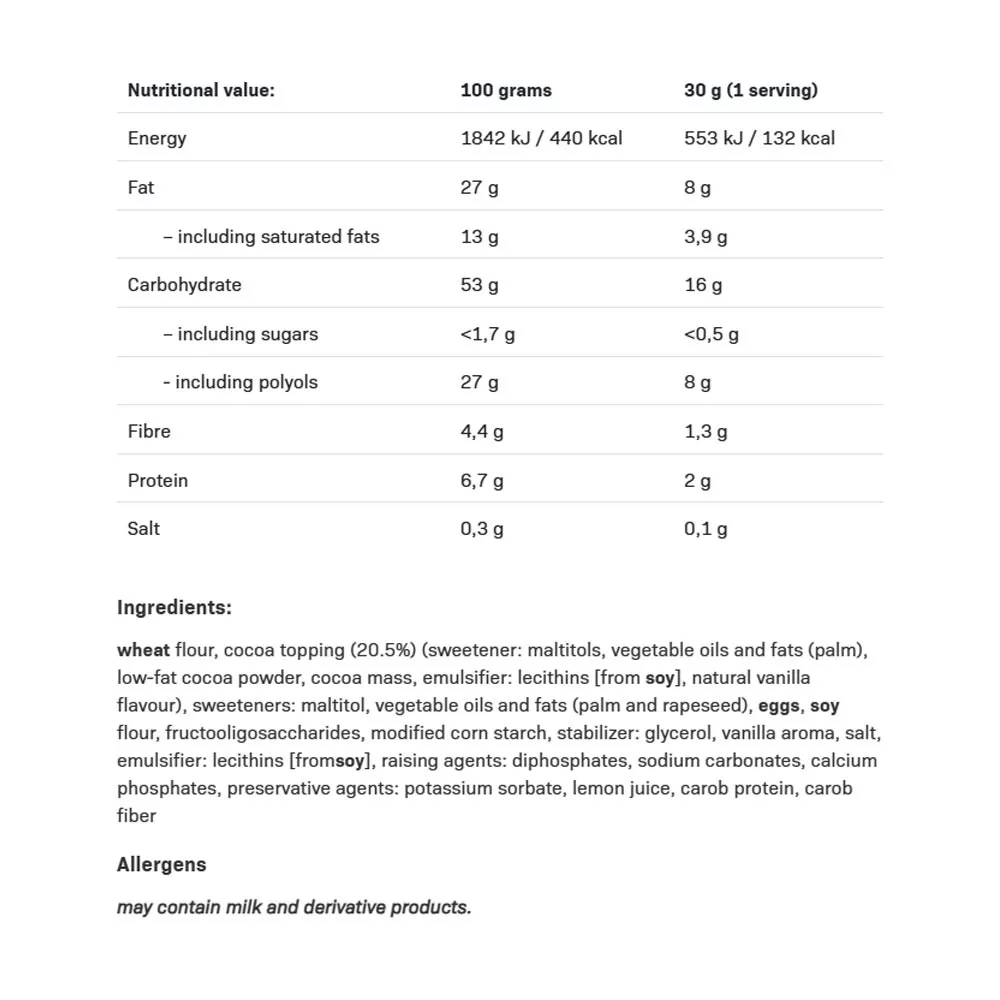Waffel mit Vanillegeschmack und zuckerfreier Kakaoglasur. Enthält Süßungsmittel. Übermäßiger Verzehr kann abführend wirken. Nicht verzehren, wenn Sie allergisch (überempfindlich) gegen einen der Inhaltsstoffe sind. Milch und Milchprodukte können enthalten sein.