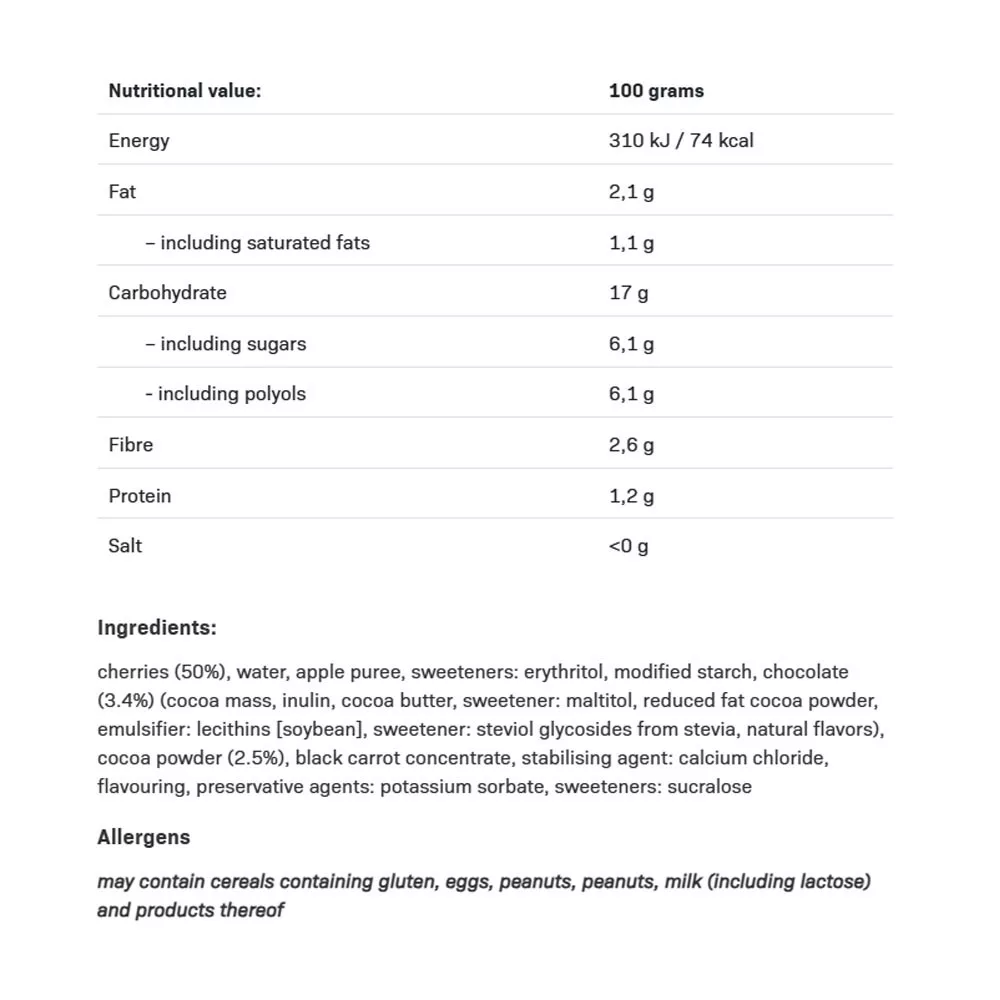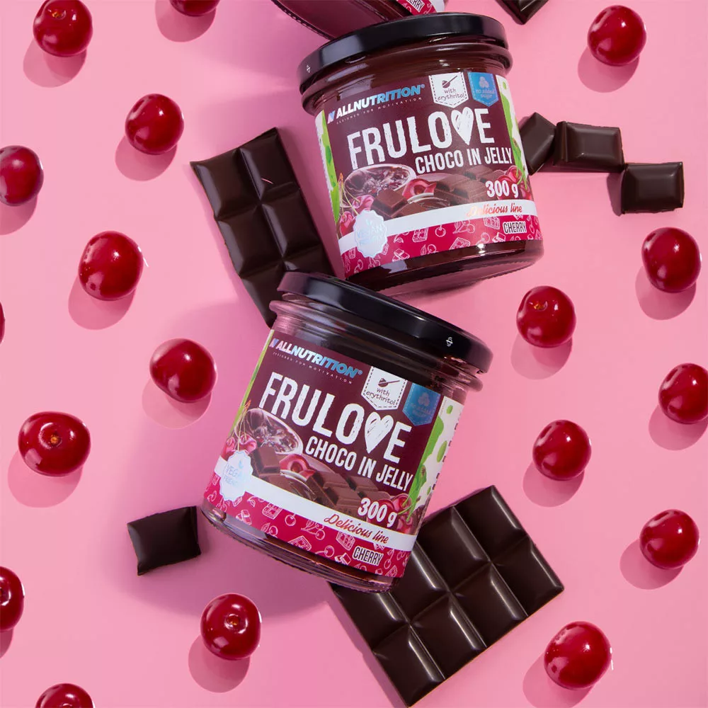 ALLNUTRITION Choco In Jelly Cherry sind saftige Kirschen in Schokoladen-Gelee, auch bekannt als Frużelina. Choco In Jelly Cherry hat eine leichte, geleeartige Konsistenz, in die wir reife Kirschen getaucht und mit süßer, zarter Schokolade ergänzt haben.