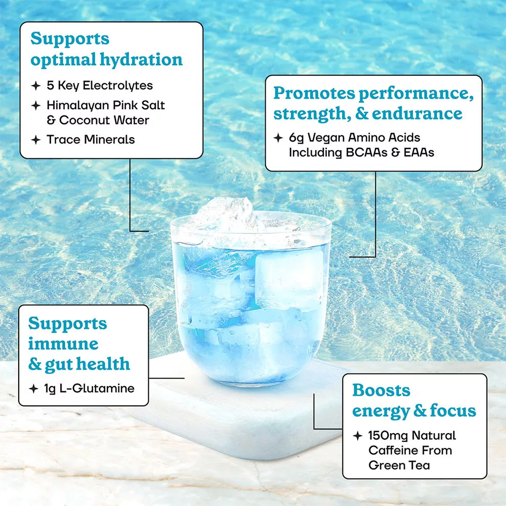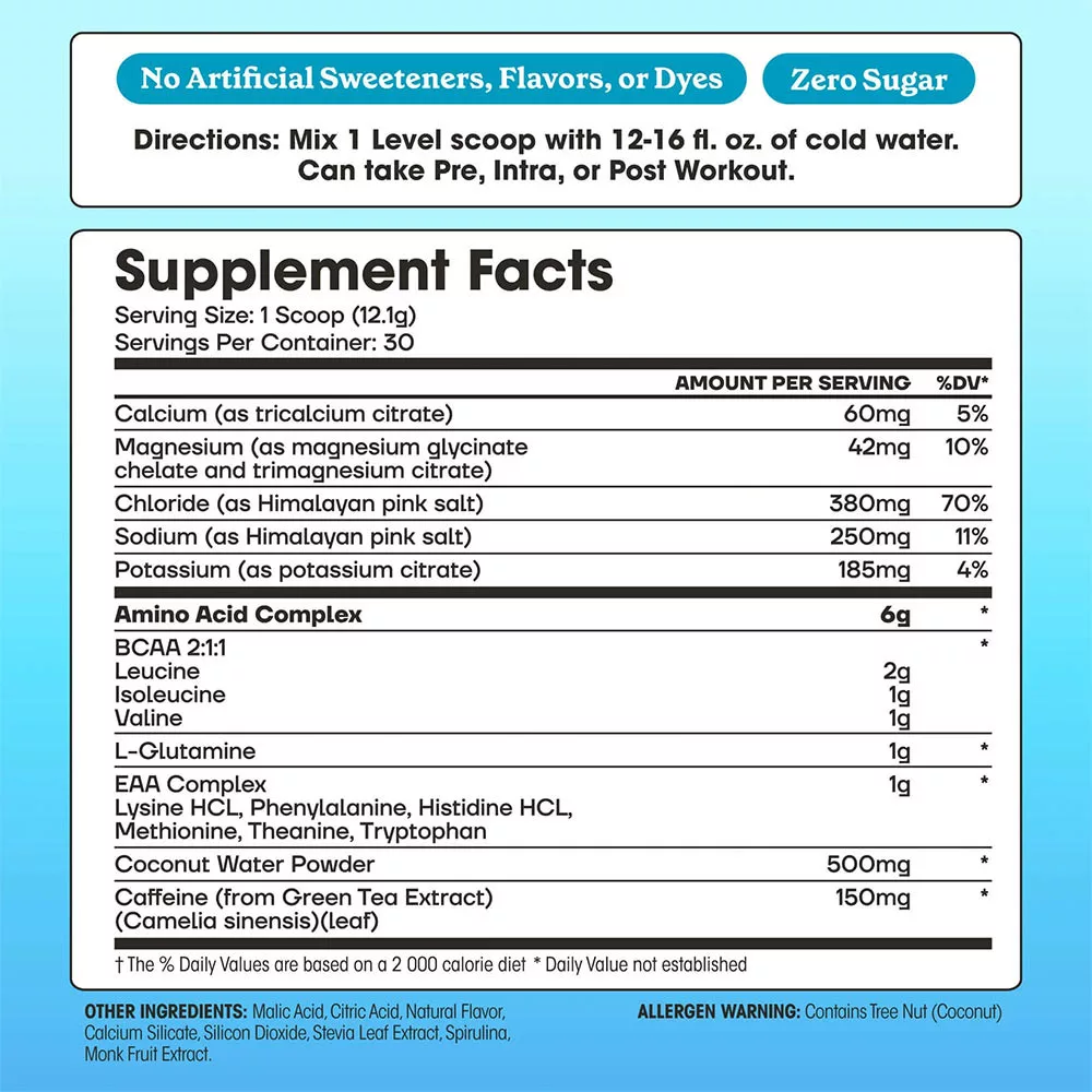 Diese natürlich gesüßte Formel enthält wichtige Aminosäuren, darunter alle 9 essenziellen Aminosäuren, BCAAs und L-Glutamin, sowie die Elektrolyte Natrium, Kalium, Chlorid, Kalzium und Magnesium, um den Körper wieder aufzufüllen und aufzutanken. Außerdem enthält es 150 mg natürliches Koffein, um Ihre Energie und Leistungsfähigkeit zu steigern.
