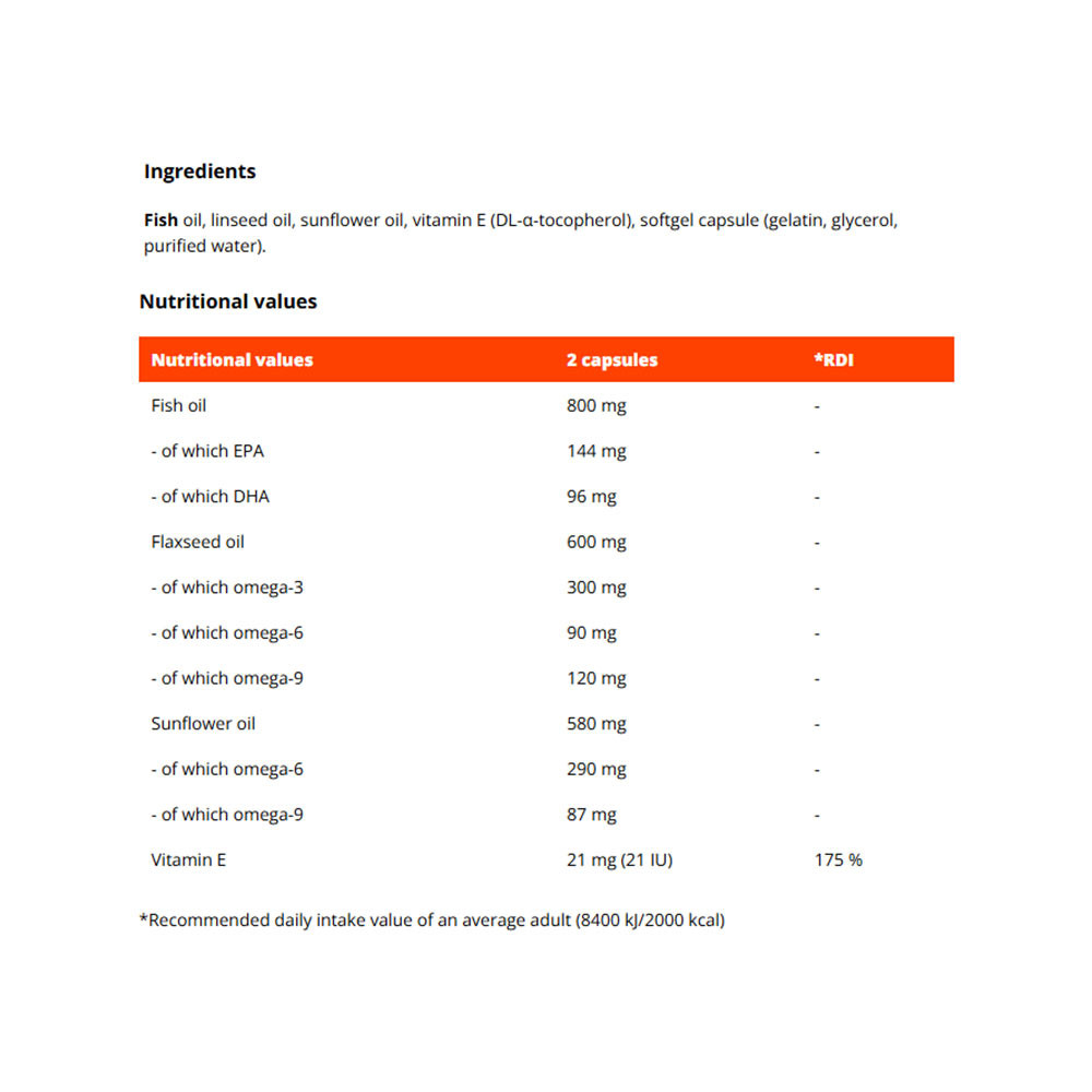 • enthält 800 mg Fisch-, 600 mg Leinsamen- und 580 mg Sonnenblumenöl