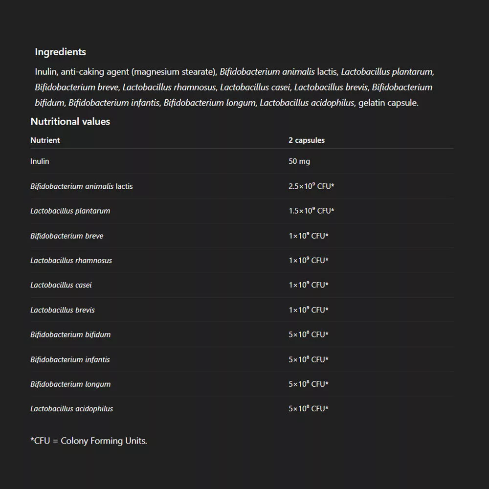 ProbioTen ist ein funktionelles Nahrungsergänzungsmittel, das zehn probiotische Bakterienstämme und Inulin enthält. Probiotische Bakterien sind Mikroorganismen, die auch häufig im Mikrobiom des Darms vorkommen. In unserem sorgfältig formulierten Produkt sind sie in einer Menge von 10 Milliarden KBE (koloniebildenden Einheiten) enthalten.