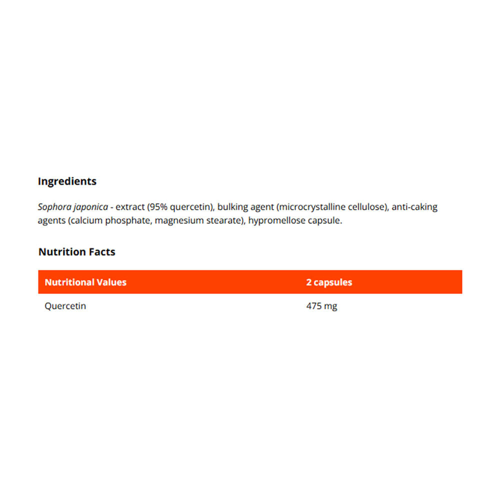 Quercetin gehört zu einer bekannten Gruppe der Flavonoide. Genauer gesagt handelt es sich um einen Pflanzenextrakt aus dem Japanischen Schnurbaum (Sophora japonica), der 95 % Quercetin enthält und in einer praktischen Kapselform für eine einfache Einnahme angeboten wird. Neben Pflanzen kommt Quercetin auch natürlich in bestimmten Obst- und Gemüsesorten vor, insbesondere in Zwiebeln, Äpfeln und Trauben. Sie können es jedoch auch aus hochkonzentrierten Nahrungsergänzungsmitteln beziehen. Jede Portion dieses Produkts liefert eine funktionelle Dosis von 475 mg Quercetin und ist damit eine großartige Ergänzung für Ihre tägliche Routine als Teil eines gesunden Lebensstils. Es ist glutenfrei, laktosefrei und gentechnikfrei sowie rein pflanzlichen Ursprungs, wodurch es sowohl für Vegetarier als auch für Veganer ideal ist.