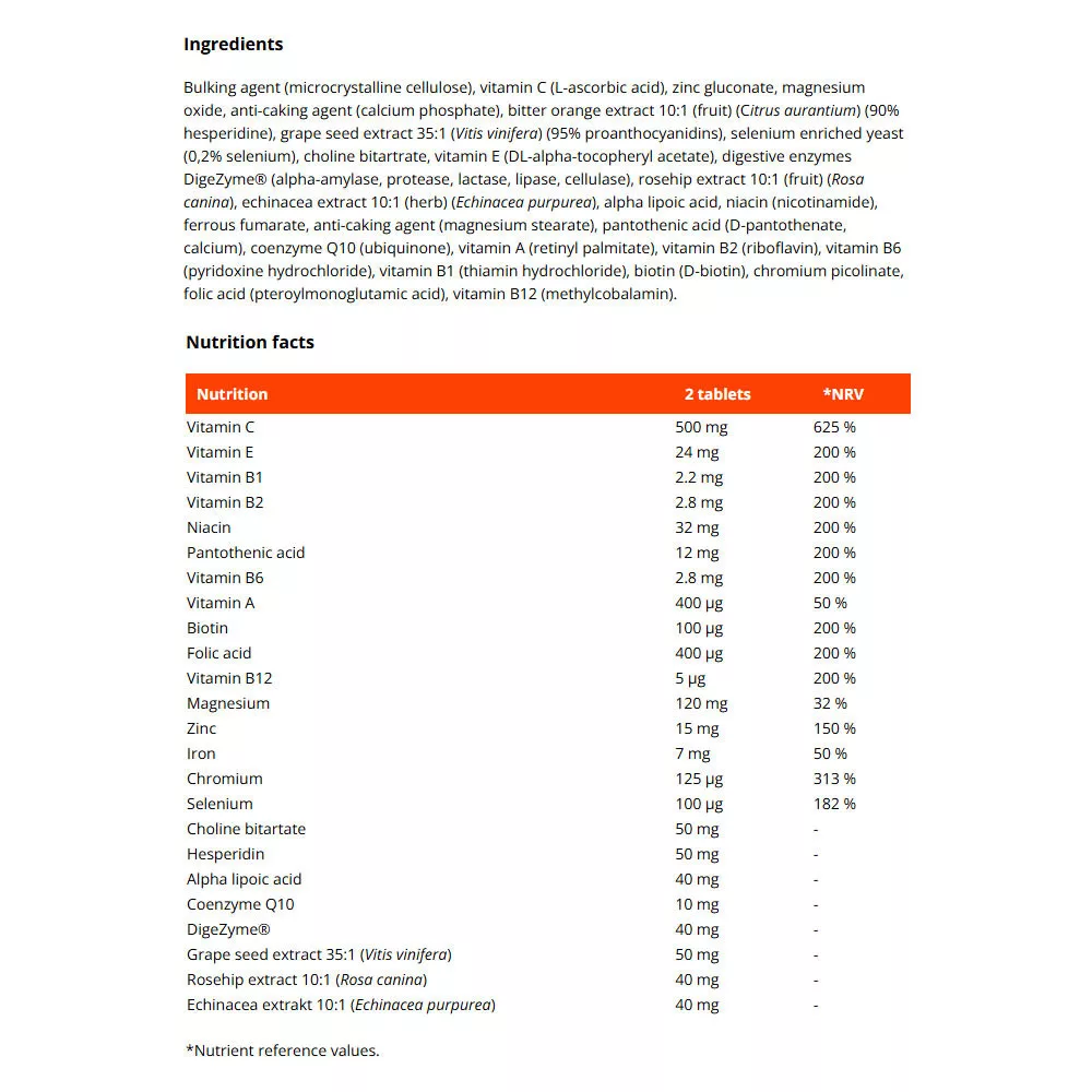 Um die umfassende Formel zu komplettieren, sind zudem Extrakte aus Purpursonnenhut (Echinacea purpurea), Hagebutte (Rosa canina) und nicht zuletzt Traubenkern (Vitis vinifera) enthalten, das mit einem hohen Extraktionsverhältnis von 35:1 und einem Proanthocyanidingehalt von 95 % überzeugt.