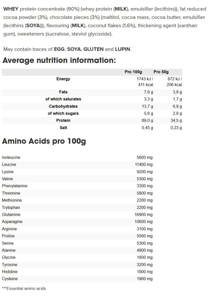 Die angegebene empfohlene Tagesdosis darf nicht überschritten werden. Sie sollten nicht als Ersatz für eine abwechslungsreiche Ernährung verwendet werden. Außerhalb der Reichweite von kleinen Kindern aufbewahren. Vor Wärme, Feuchtigkeit und Sonnenlicht geschützt lagern. Eiweiß trägt zu einer Zunahme der Muskelmasse bei. Eine ausgewogene und abwechslungsreiche Ernährung und eine gesunde Lebensweise sind wichtig. Enthält natürlich vorkommende Zuckerarten. Gemäß der Handelspraxis.