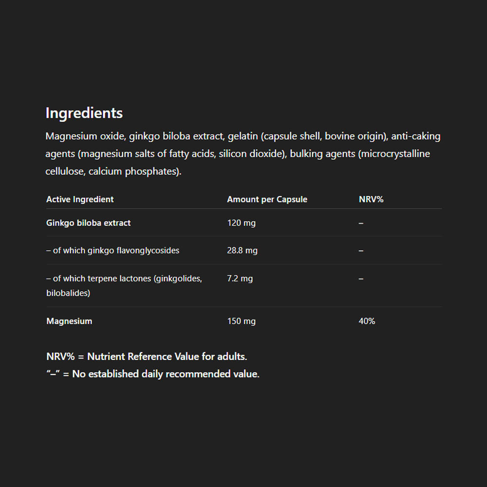 Ginkgo-Flavonoide tragen zu einer normalen Funktion des peripheren Kreislaufsystems und zu einem ordnungsgemäßen Blutfluss bei. Ginkgo Biloba kann helfen, die Gehirnfunktion im Alter aufrechtzuerhalten. Magnesium trägt zur ordnungsgemäßen Funktion des Nervensystems und zur Aufrechterhaltung einer normalen psychischen Funktion bei.