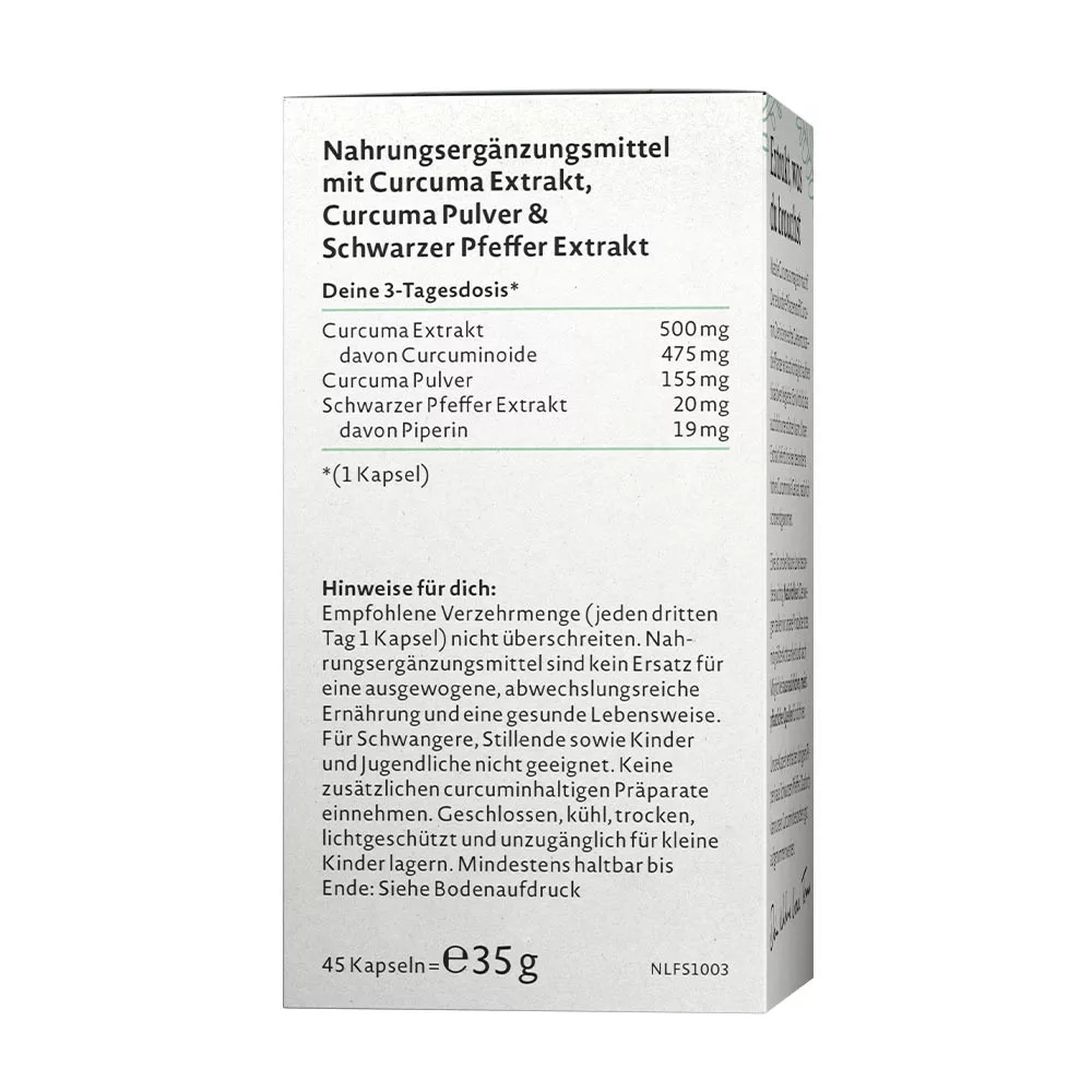 Was die Curcuma so magisch macht? Der sekundäre Pflanzenstoff Curcumin. Ein natürliches Antioxidans, das die Pflanze von innen stärkt. Was für ein tolles Vorbild! Unser Extrakt liefert dir einen besonders hohen Curcumin-Gehalt, natürlich schonend gewonnen. Unsere Kapseln enthalten übrigens Piperin aus schwarzem Pfeffer. Dadurch kann unser Curcumin besonders gut aufgenommen werden.