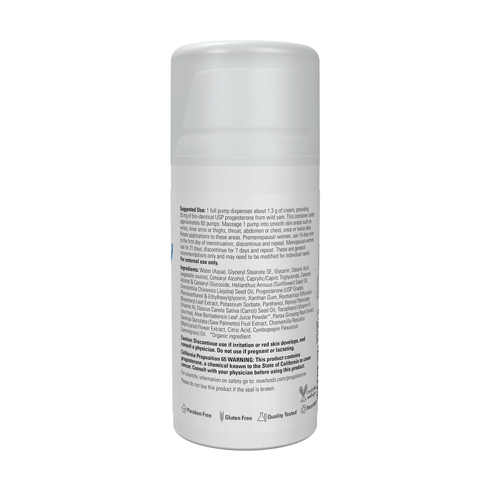 Inhaltsstoffe: Wasser (Aqua), Glycerylstearat SE, Glycerin, Stearinsäure (pflanzliche Quelle), Cetearylalkohol, Caprylic/Capric Triglyceride, Cetearyl Alcohol Cetearyl Glucoside, Helianthus Annuus (Sonnenblume) Samenöl, Simmondsia Chinensis (Jojoba) Samenöl, Progesteron (USP-Qualität), Phenoxyethanol Ethylhexylglycerin, Xanthangummi, Rosmarinus Officinalis (Rosmarin)-Blattextrakt, Kaliumsorbat, Panthenol, Retinylpalmitat (Vitamin A), Daucus Carota Sativa (Karotte)-Samenöl, Tocopherol (Vitamin E) (sojafrei), Aloe Barbadensis-Blattsaftpulver, Panax-Ginseng-Wurzelextrakt, Serenoa Serrulata (Sägepalme)-Fruchtextrakt, Chamomilla Recutita (Matricaria)-Blütenextrakt, Zitronensäure, Cymbopogon Flexuosus (Zitronengras)-Öl. Bio-Zutaten.