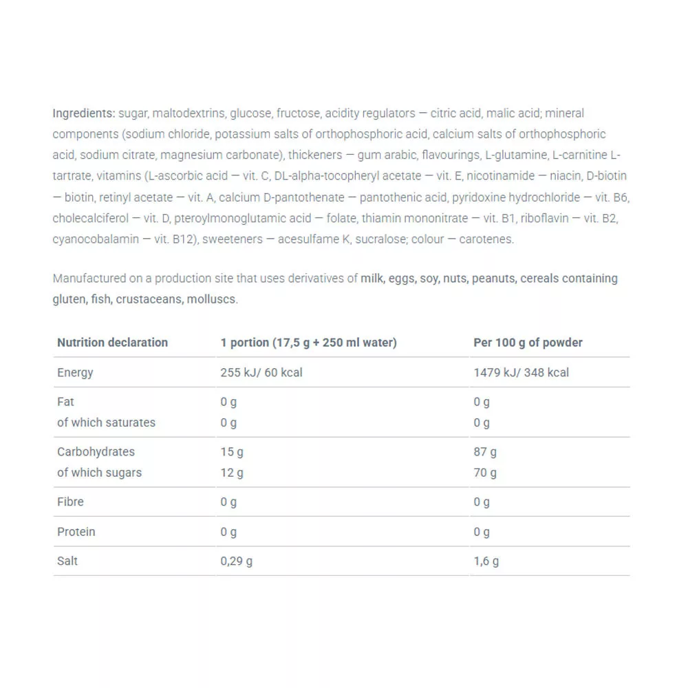 ISO PLUS® – Nahrungsergänzungsmittel in Pulverform zur Zubereitung eines Kohlenhydrat-Elektrolyt-Getränks mit Vitaminzusammensetzung. Mit Zucker und Süßungsmitteln. Geschmack: Eistee.