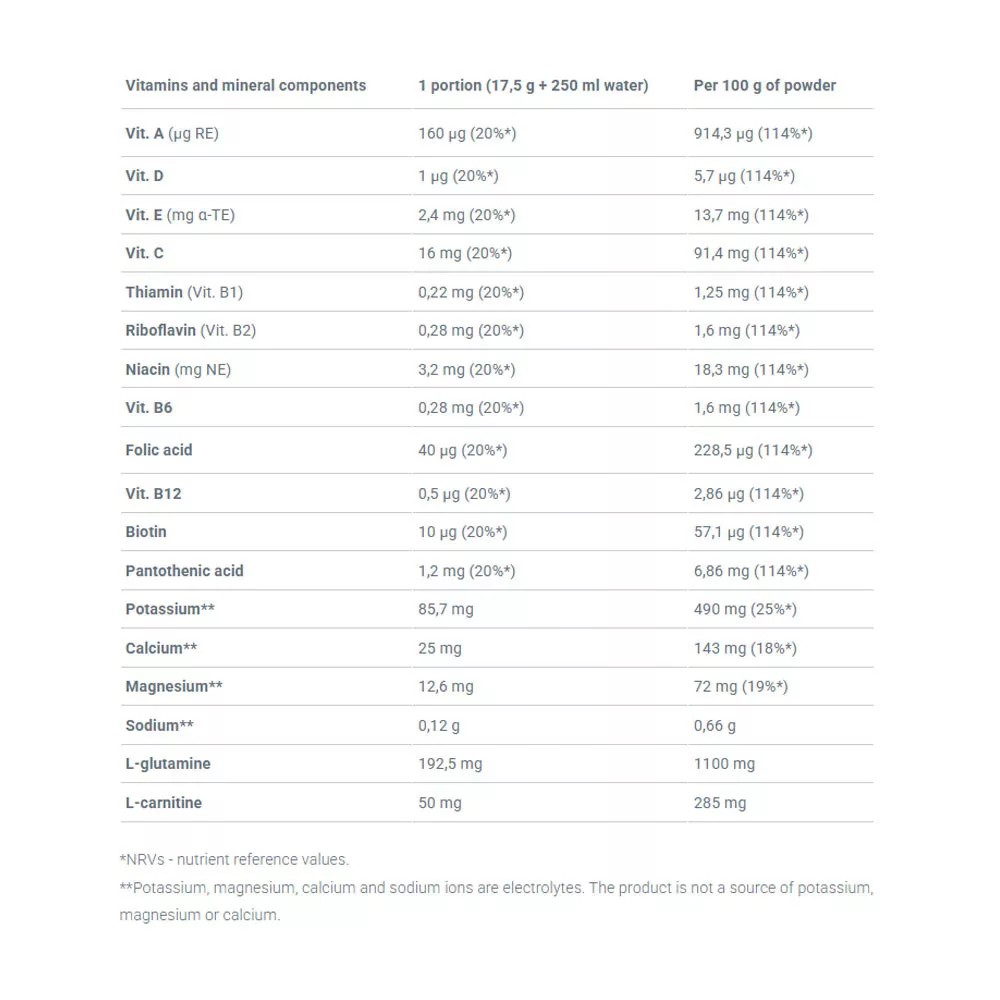 1 Portion täglich während des Trainings. Lösen Sie 1 Portion (17,5 g Pulver = 1½ Messlöffel) in 250 ml Wasser auf, verwenden Sie einen Shaker für mindestens 10 Sekunden.