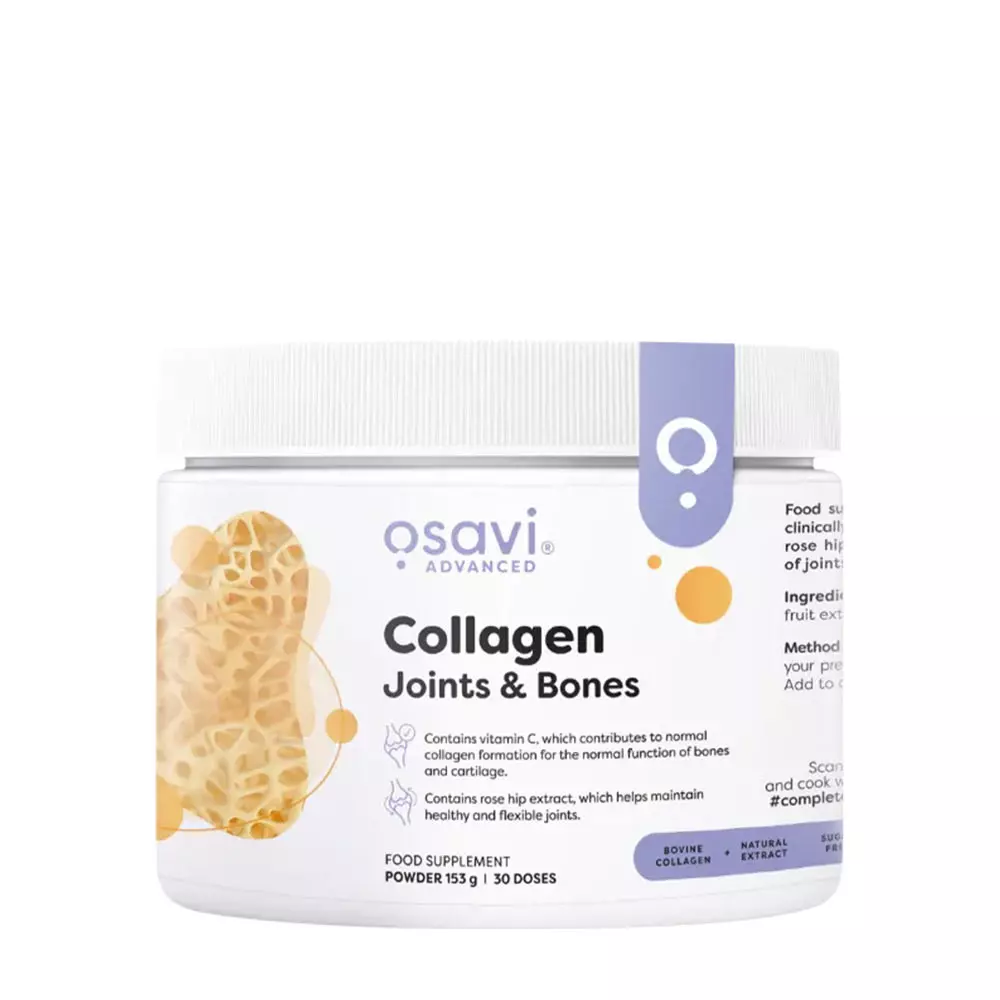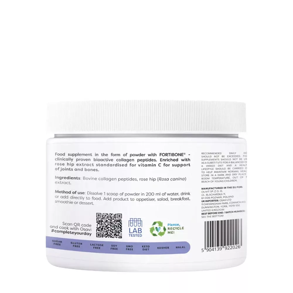 OSAVI Collagen Joints and Bones enthält klinisch getestetes FORTIBONE® bioaktive Kollagenpeptide. Es ist angereichert mit Hagebuttenextrakt, standardisiert auf einen Vitamin-C-Gehalt von 70 %, was die richtige Produktion von Kollagen für die gesunde Funktion von Knochen und Knorpel unterstützt.