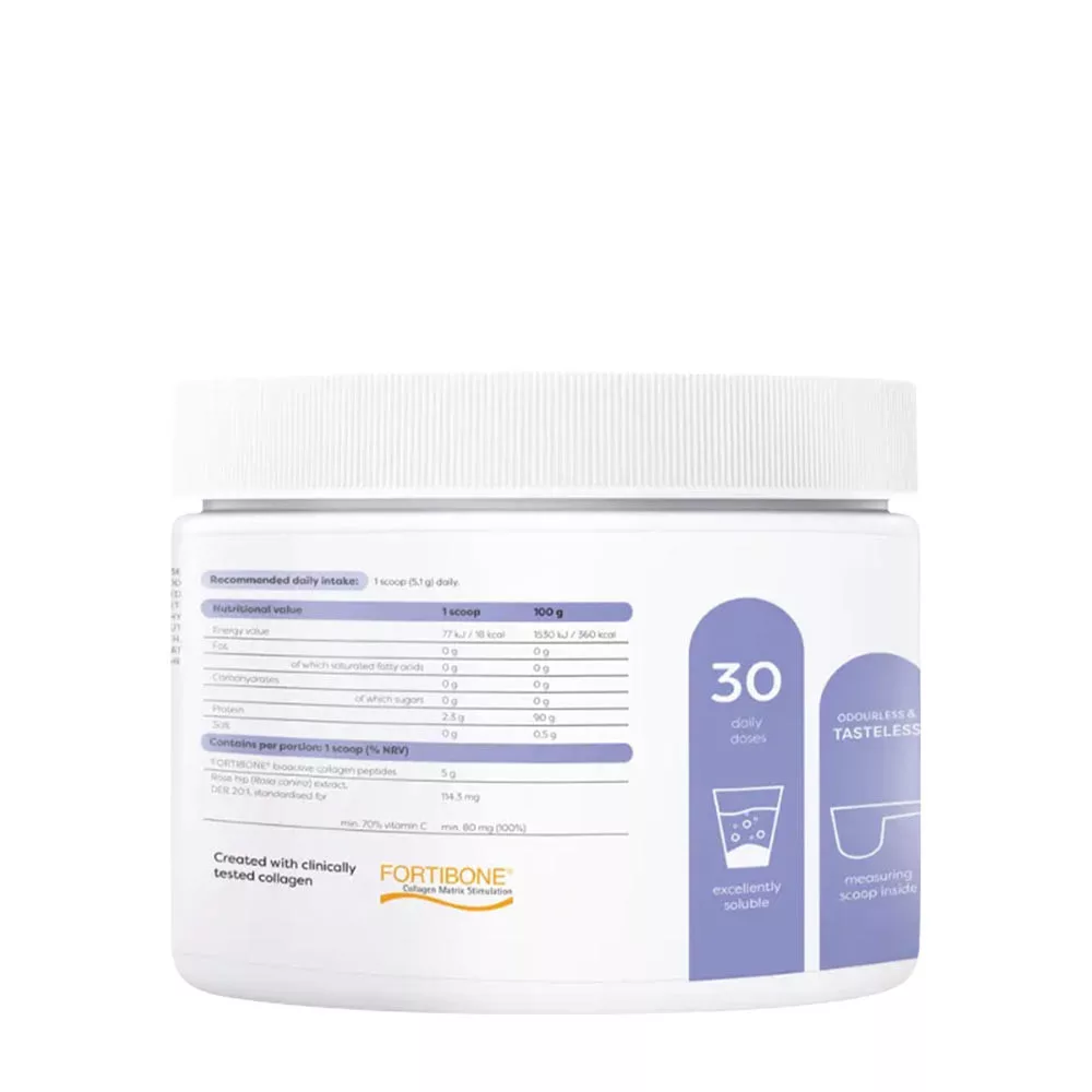 Nahrungsergänzungsmittel in Pulverform mit FORTIBONE® – klinisch erprobte bioaktive Kollagenpeptide. Angereichert mit Hagebuttenextrakt, standardisiert auf Vitamin C, zur Unterstützung von Gelenken und Knochen.