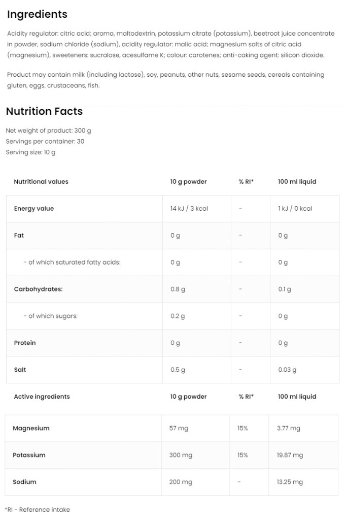 • SODIUM - Es reguliert die Verteilung des Wassers in deinem Organismus. Außerdem hilft es Ihnen, den richtigen pH-Wert zu halten.