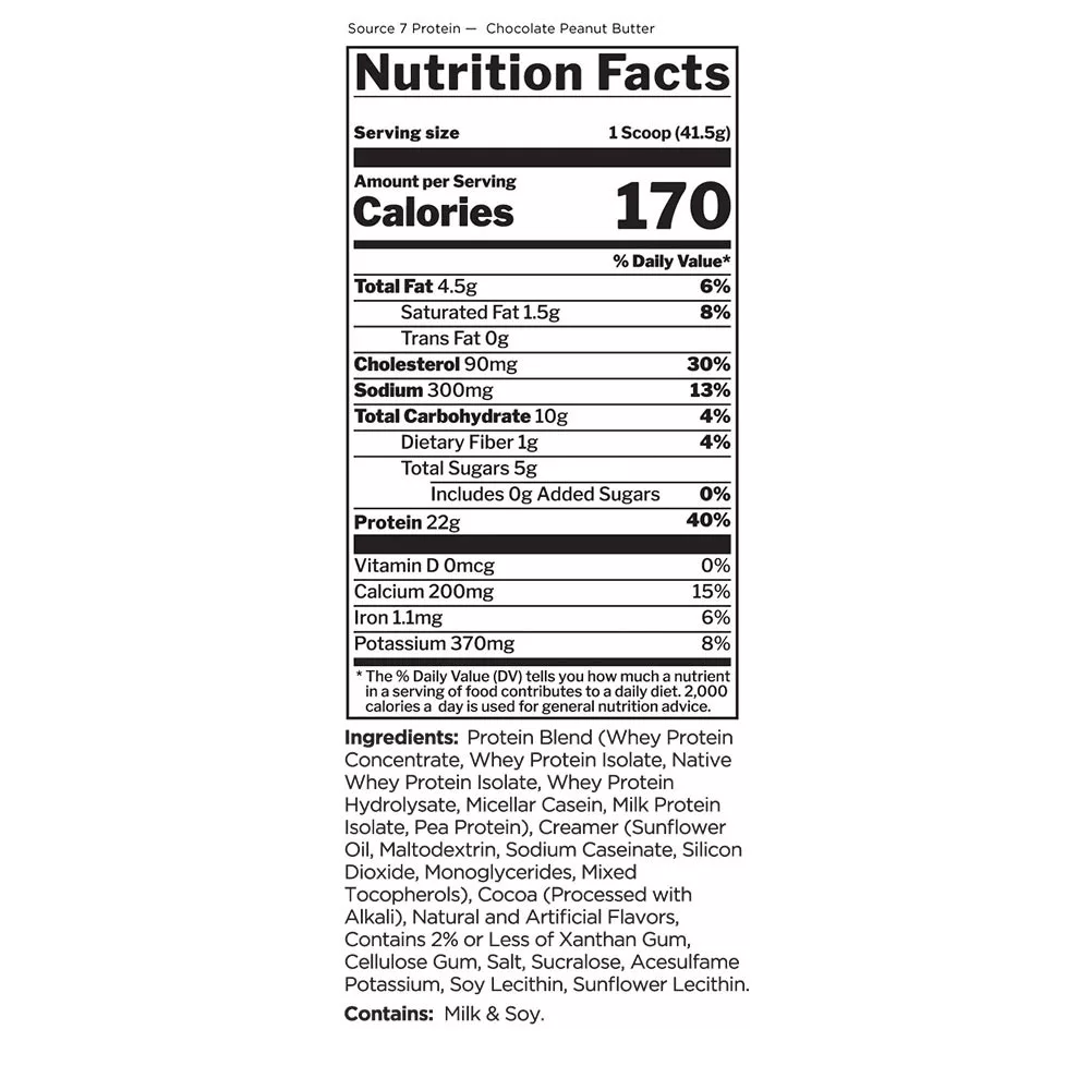 Source 7 Protein kombiniert sieben hochwertige Proteinquellen in jedem ultra-cremigen, extra-dekadenten Shake. Der außergewöhnlich gute Geschmack wird durch einfache Mixbarkeit und 22 Gramm hochwertiges Protein pro Portion ergänzt. Es ist perfekt für alle, die mit einer Proteinreise beginnen oder eine köstliche Abwechslung zum üblichen Scoop suchen—Source 7 Protein ist eine hervorragende Ergänzung für einen aktiven Lebensstil, zu jeder Zeit oder immer.