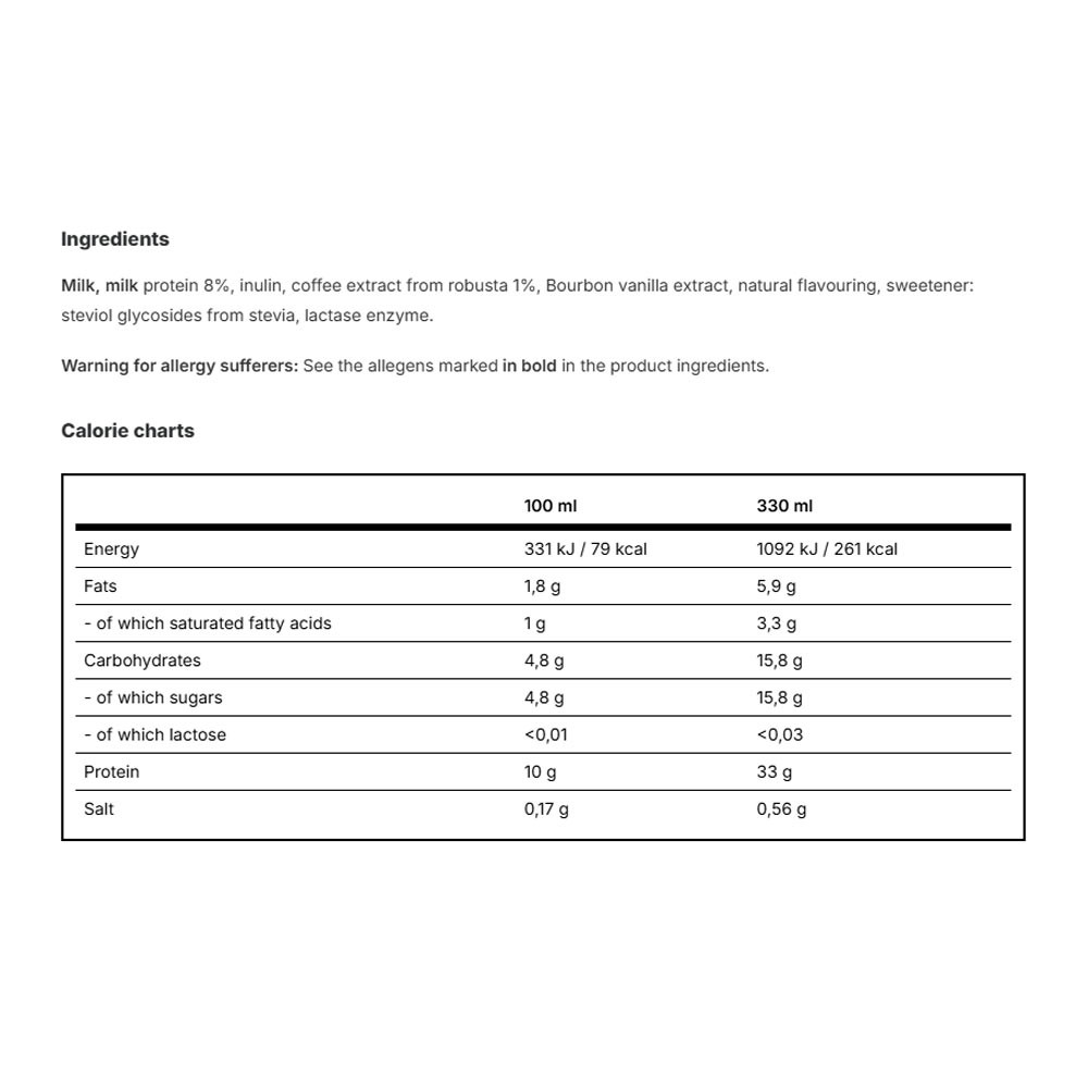 Unser Protein-Kaffee ist sowohl ein erfrischendes Getränk als auch eine vollwertige Nährstoffquelle. Er wird ausschließlich mit kalorienarmen Steviolglykosiden gesüßt, und die verwendete Milch ist laktosefrei – für einen geringeren Zuckergehalt und eine leichtere Verdauung.