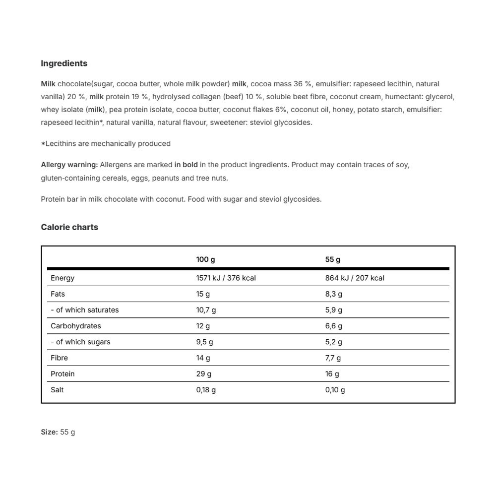 Für maximalen Genuss haben wir geraspelte Kokosnuss mit luxuriöser Kokosnussbutter und einer großzügigen Portion vollwertigem Protein kombiniert. Als Bonus ist der gesamte Riegel mit hochwertiger Milchschokolade überzogen.
