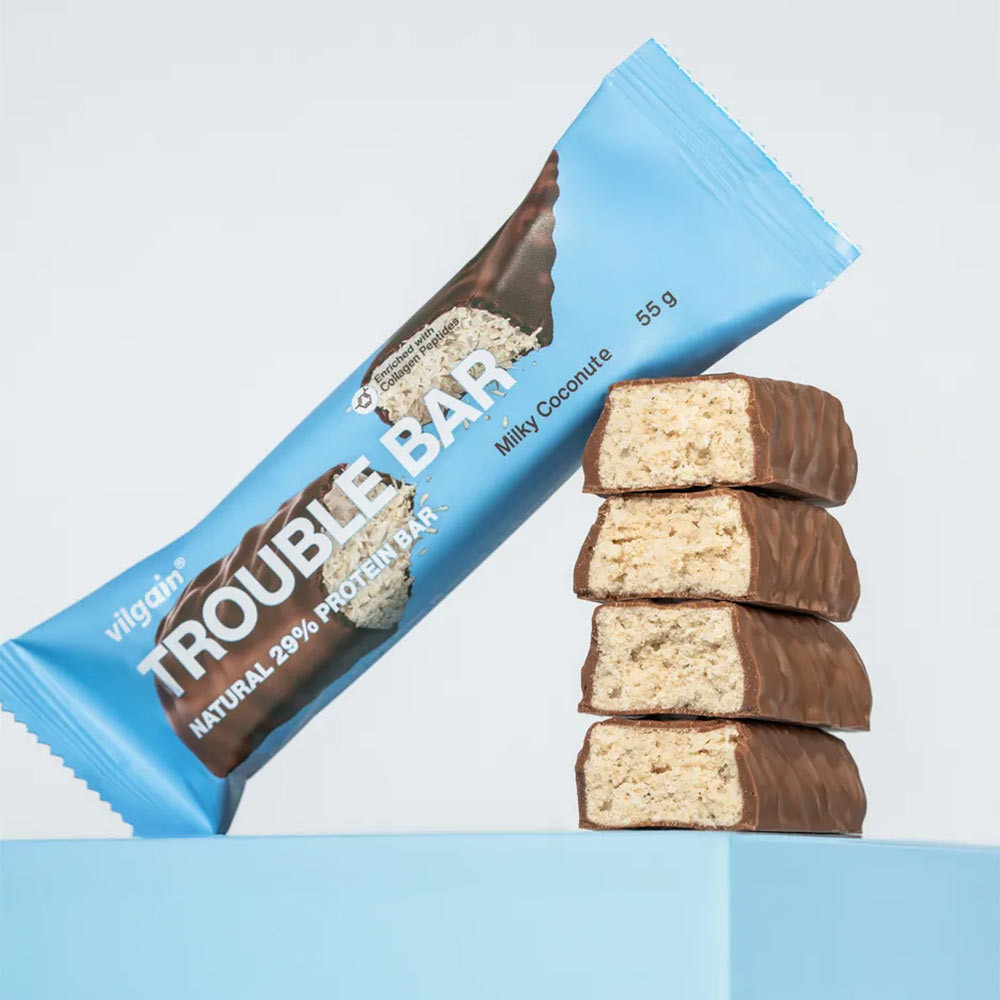 Lass dich vom unglaublich reichen Geschmack des Trouble Bars nicht täuschen! Es ist immer noch ein Proteinriegel mit einem hohen Proteingehalt von 29 %. Die Hauptkomponente ist Milchprotein, eine der am besten verwertbaren Proteinquellen. Die Matrix wird zusätzlich durch Molken- und Erbsenprotein ergänzt.
