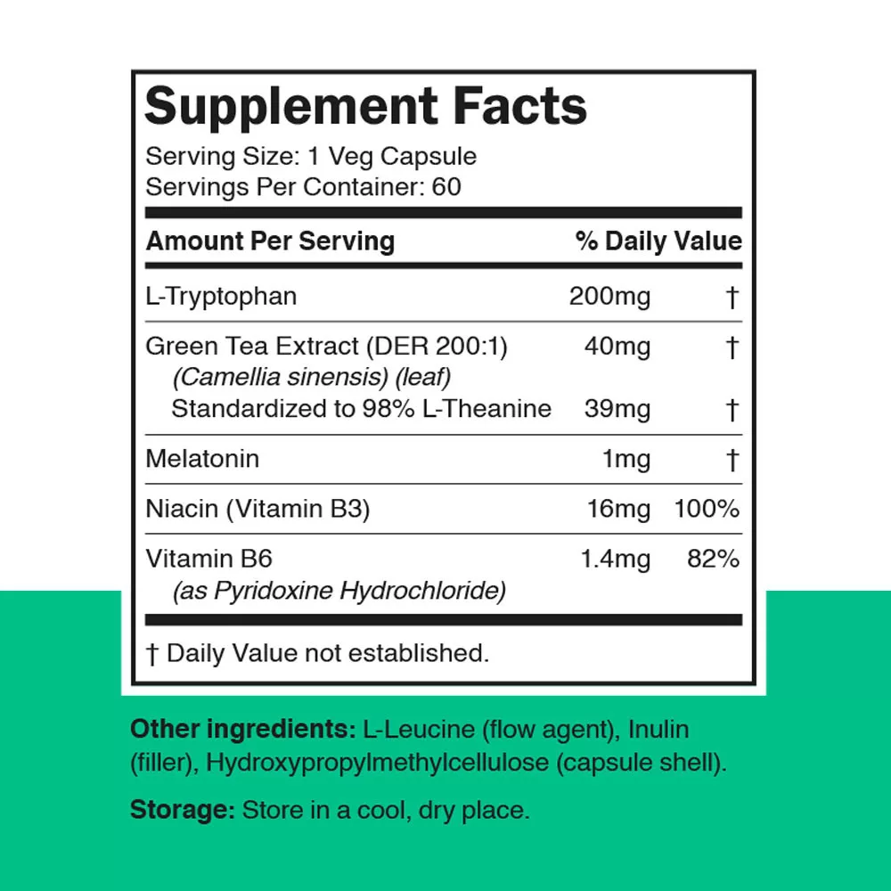 Das Produkt enthält pro Portion 1 mg Melatonin, 200 mg L-Tryptophan, 40 mg Grüntee-Extrakt (98 % L-Theanin) und B-Vitamine (B3 und B6). Diese Kombination unterstützt gleichzeitig das Einschlafen, das Stressmanagement und die mentale Entspannung.